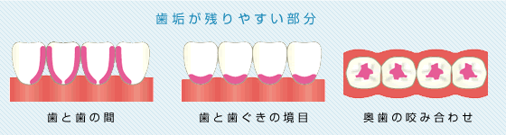 歯と歯の間・歯と歯ぐきの境目・奥歯の咬み合わせの部分です。